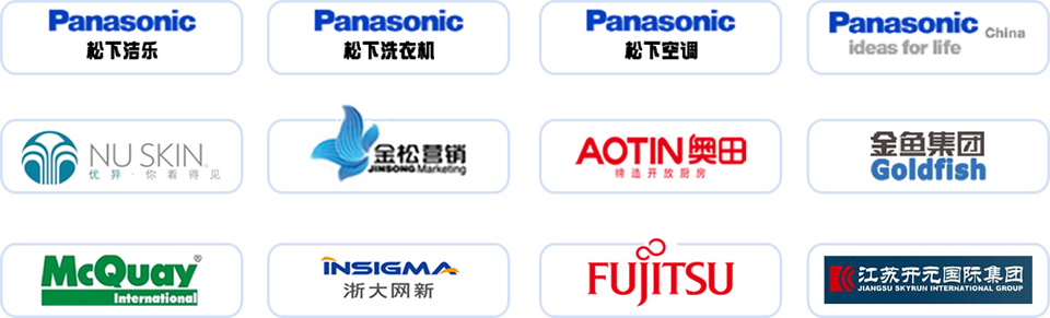 松下家电总公司、松下洁乐、松下洗衣机、松下空调、松下中国、金松营销、奥田集团、金鱼集团、富士通、浙大网新、江苏开元国际集团、McQuay等。